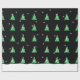 Christmas wrapping paper with a pattern of Christmas trees and snow flakes on a black background.