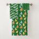 Colourful modern Christmas trees "Merry Christmas" and snowflakes green holiday bath towel set. The bath towel displays a cute pattern of colourful Christmas stylised trees in light blue, orange and yellow on green. The hand towel features the text "Merry Christmas" in bold typography and the wash cloth snow-snowflakes. Personalise it with your text. Please note that if your text takes more or less space customise it to increase or decrease the text size accordingly.