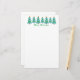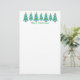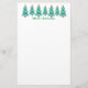 Festive Christmas trees done in pointillism, blue garland, and gold stars, brighten up the top of this stationery with the message, Merry Christmas.