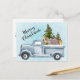 A postcard with a festive Christmas design. A watercolor truck carrying Christmas pine trees along with some woodland animals. A bear a fox and a deer standing in the back going for a ride.