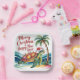 A whimsical Christmas greeting card featuring a cheerful watercolor illustration of a sea turtle sporting a festive Santa hat and adorned with twinkling Christmas lights strung around its shell, set against a backdrop of a swaying palm tree also illuminated with warm lights and a serene turquoise ocean. The turtle's shell is painted with intricate patterns of tropical flowers in soft pastel hues of coral, lavender, and seafoam green, while the ocean shimmers with subtle gradients of blue and silver, creating a peaceful yet celebratory atmosphere. "MERRY CHRISTMAS & HAPPY NEW YEAR" appears in a playful, hand-lettered font across the top of the card, with the interior offering a clean white space for a personalised message and a subtle, repeating pattern of small seashells along the bottom edge to reinforce the tropical theme. The overall tone is lighthearted and joyful, perfect for sending warm wishes to friends and family during the holiday season.