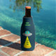 This awesome Christmas bottle cooler features a digital art image of an alien spacecraft decorated with bright coloured Christmas lights. Inside the UFO looking out through the window there is a green alien with black eyes wearing a festive Santa hat. There is a cone of light coming from the flying saucer. The shadow of a message is being projected to Earth. The message says Ho Ho UFO. Holiday greetings from outer space for all Earthlings. There is custom text so you can personalise this design with a name or message of your choice.