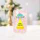 This awesome Christmas can glass features a digital art image of an alien spacecraft decorated with bright coloured Christmas lights. Inside the UFO looking out through the window there is a green alien with black eyes wearing a festive Santa hat. There is a cone of light coming from the flying saucer. The shadow of a message is being projected to Earth. The message says Ho Ho UFO. Holiday greetings from outer space for all Earthlings.