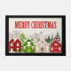 A Merry Christmas doormat with quaint village buildings.