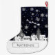 Add a personalised touch to your mantel with this festive personalised Christmas village stocking. Featuring a charming Christmas village nestled among pine trees beneath a sparkling starry night sky, the design captures Santa’s sleigh and flying reindeer soaring overhead through delicate falling snowflakes. Your name is displayed in modern typography for a stylish, custom finish, making it a perfect piece of festive holiday décor. Spacious and decorative, this stocking is ready to be filled with Christmas Eve surprises and cherished for years to come.