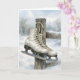 A pair of white ice skates hangs from a rustic wooden post, surrounded by softly falling snow in a serene winter landscape of snow-covered trees, illustrated in watercolor