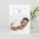 Christmas peace in traditional lettering, non-secular holiday photo card with winter blue holly and pine sprigs and red berries.