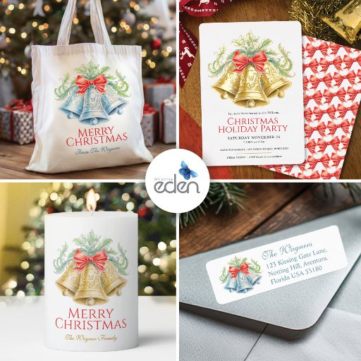Watercolor three silver blue coloured bells and a red bow with stylised green foliage custom tote bag. Personalise with your own family initial or remove on the central bell and your own greeting (currently reads Merry Christmas) and your family name or company name in grey silver script or receivers name. Great for a festive Christmas holiday gift bag that strong and reusable. Original hand watercolor painting and design by Sarah Trett for www.mylittleeden.com