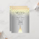 Minimal, modern gold Christmas tree in combination with silver foil background and adorable, delicate snowflakes. Luxury, simple and elegant winter wedding invitation, with touch of Christmas spirit.