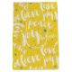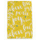 Christmas white text design love, peace, joy and believe with blue stars over yellow background. Customisable gift bag template