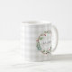 Custom-designed coffee mug for the holidays featuring watercolor Christmas wreath design on rustic modern farmhouse buffalo check pattern.