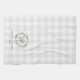 Custom-designed kitchen hand towel for the holiday season featuring personalised family name with watercolor Christmas wreath design on farmhouse style buffalo check pattern.