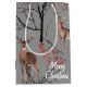Snowflake overlay on chickadees and red berries with deer pattern on grey background.