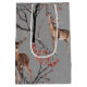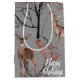 Snowflake overlay on chickadees and red berries with deer pattern on grey background.