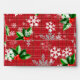 Christmas themed envelope design featuring white snowflakes and winter greenery, red berries on a red plaid background.