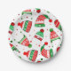 This design features a collection of warm winter Christmas hats in red, green and white with red stars on a white background.