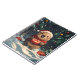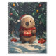 A wombat dressed for Christmas in a scarf and hat holds a present as it snows.