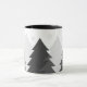 This ceramic coffee mug is shown in a refreshing image of woodlands fir tree print. Snowflakes grace the mug cascading down from the rim.