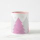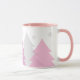 This ceramic coffee mug is shown in a refreshing image of woodlands fir tree print. Snowflakes grace the mug cascading down from the rim.