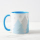 This ceramic coffee mug is shown in a refreshing image of woodlands fir tree print. Snowflakes gracefully descending from rim,