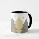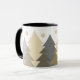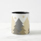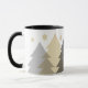 This ceramic coffee mug is shown in a refreshing image of woodlands fir tree print. Snowflakes gracefully descending from rim,