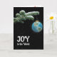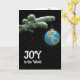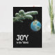 "Joy to the World" text with globe ornament hangs from a snowy pine tree branch, illuminated against a black night sky filled with shimmering stars.