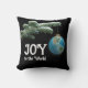 "Joy to the World" text with globe ornament hangs from a snowy pine tree branch, illuminated against a black night sky filled with shimmering stars.