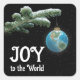 "Joy to the World" text with globe ornament hangs from a snowy pine tree branch, illuminated against a black night sky filled with shimmering stars.