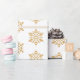This Christmas wrapping paper is shown with a festive holiday gold snowflakes print.