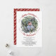 This Christmas card features a wreath made of greenery surrounding a family photo. The words 'Merry Christmas' gracefully curve over the image, with the family name beautifully written below in a flowing script, accented by red dots. A heartfelt message in black ink is placed under the photo, extending warm wishes to the recipient. On the back, a deep red background showcases a diagonal pattern of the phrase 'Merry Christmas' in white.