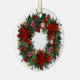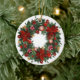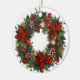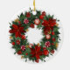 A digital art illustration of a Christmas ornament, featuring a wreath design. The wreath is composed of green pine branches, red poinsettias, red berries, golden berries, and red and white striped candies. The ornament is round and white, with a gold string at the top for hanging. The background is plain white. The style is reminiscent of classic Christmas decorations, with a modern digital art twist. The colour palette is dominated by reds, greens, and golds, creating a festive and warm atmosphere.