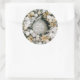 Round sticker features a beautiful snow-flocked pine wreath decorated with white and gold Christmas tree ornaments and flowers with a greeting and your name or company name in the middle. MATCHING items in our collection.
