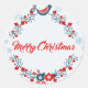 This classic round sticker features a festive wreath design perfect for adding a touch of holiday cheer to any item. At the centre, the words "Merry Christmas" are written in a bold, cursive font in a cheerful red hue, capturing the essence of the season's joy and warmth. Encircling the greeting, a decorative array of winter flora, including red holly berries, dark green leaves, and charming blue flowers, creates a traditional wreath motif.