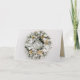 Folded corporate business holiday greeting cards feature a beautiful snow flocked pine wreath decorated with white and gold Christmas tree ornaments and flowers on the front and a personalised greeting and company name on a gold background on the inside.