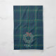 Personalized Christmas kitchen hand towel featuring festive Christmas wreath with classic forest green and navy tartan plaid design.