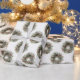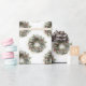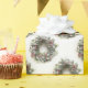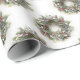 A roll of Christmas wrapping paper features an evergreen wreath with red berries and ornaments dusted with snow - fun for holiday gift giving
