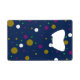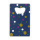 A pattern of variously sized circles in gold, white, purple, and green is scattered across a dark blue background. The circles are evenly spaced and vary in diameter.