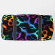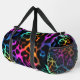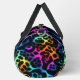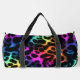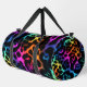 This image features a duffel bag adorned with a visually striking leopard print pattern. The spots of the leopard print are rendered in a vibrant, multi-coloured faux fur texture, showcasing a spectrum of rich hues including blues, greens, yellows, oranges, and various shades of pink and purple. These colourful, textured spots contrast sharply against the dark, likely black, background. The bag is equipped with black carrying straps. This design offers a playful yet bold statement, making it an ideal accessory for those seeking a unique and eye-catching travel or gym bag.