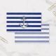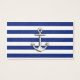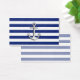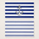A silver chrome like anchor applique on a horizontal navy blue style stripes print decor for a perfect nautical look.