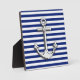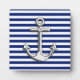 A modern nautical style silver chrome like anchor design on a racy blue stripes print decor for a fine custom gift.