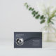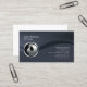 This simple elegant and professional hair stylist business card features a black background. A black hued wave streams from the left to the right, splitting the card into two sections. A circular chrome hair style icon sits on this wave, on the left side of the card, while your name and title appear on the upper left and your business name and contact details appear on the bottom right. Designed for businesses or professions related to fashion, beauty, style, clothing, cosmetics, makeup, women, ladies themes.
