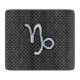 A chrome like Capricorn zodiac sign on a carbon fibre style design texture print background. A modern urban racy design for a great custom birthday gift idea.