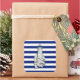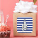A silver chrome like lighthouse design on a navy blue stripes decor. A modern nautical gift.