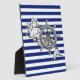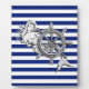 A silver chrome like mermaid figure design on a navy blue stripes decor. A modern nautical gift.