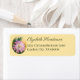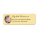 Floral artwork depicting a purple-pink and creamy white chrysanthemum blossom with a bud and leaf set against golden yellow ochre and olive green accents this easy to personalise label.