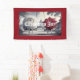 This is a pretty Chrysanthemum & Poinsettia Christmas Joy Indoor Banner. The banner conveys the Christmas Spirit with a black and white photo created with generative art and pretty flowers swinging on swings. The art style is a black and white photo with characters in colour. The art features a white chrysanthemum flower character and a poinsettia flower character swinging outside. There is gold trim on some chrysanthemum flower petals. Both characters are wearing white shoes. The background is a serene landscape with trees and a building. There is a poinsettia red border on the banner.