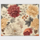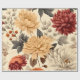 This elegant floral design features a stunning array of large chrysanthemums in warm shades of cream, soft gold, deep red, and vibrant orange. The lush flowers are surrounded by delicate foliage in muted greens and taupe, all set against a light cream background. The harmonious blend of rich autumnal tones and soft neutral leaves creates a timeless and refined aesthetic, capturing the beauty of chrysanthemums in full bloom.