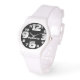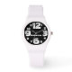 Fun black background with white chunky numbers, this personalised watch is eye catching and easy to read. the 3, 6, 9, and 12 are larger than the other numbers. Cute, functional and fun!