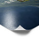 Photo print of a landscape with the church and the houses of the small village of Hallstatt in Austria, with reflection in the still water of Hallstatt lake and in the background the Alps mountains on a beautiful clear sky summer day.