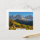 Photo postcard of the small village Sankt Magdalena with the prominent church surrounded by trees in autumn colours in front of high Dolomites mountain peaks in the last light of the day in the Villnöss (Funes) valley in South Tyrol, Italy with a white edge and the text 'Dolomites'.